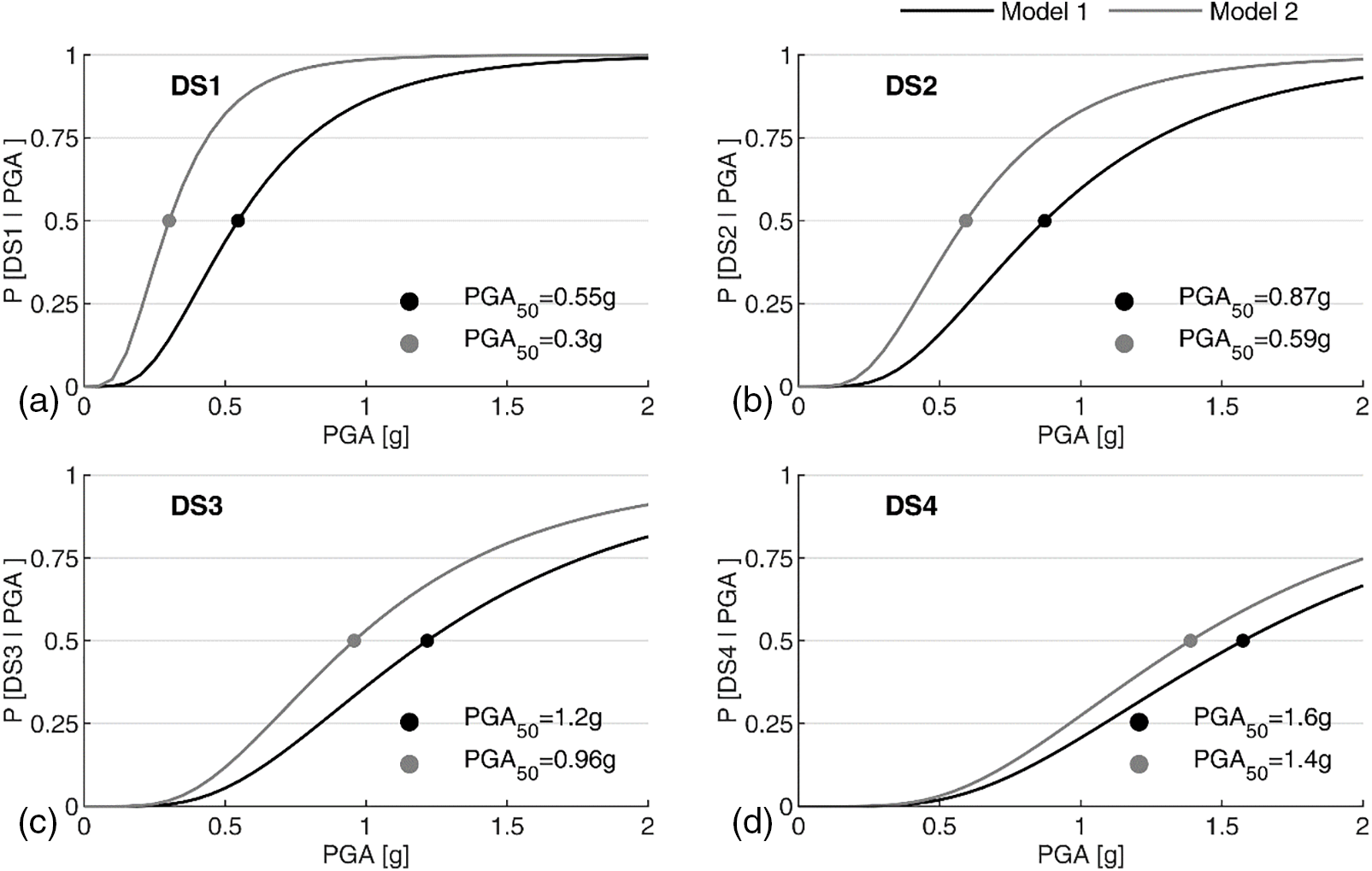 Accounting for all the above-mentioned DSs, fragility curves for the bridges in Model 1 and Model 2 are reported in the graphs in Fig. 8. As expected, landslide-induced deformations on elastomeric bearing induced a general increase in fragility for all the considered DSs. Observing the fragility curves, the most significant fragility variation was registered to DS1 (Fig. 8a), where the median value of the fragility curve (probability equal to 50% of exceeding a given DS) presented an increase equal to 44.7%. Conversely, the influence of permanent landslide-induced deformations on elastomeric bearings decreased for increasing DS limits. Indeed, the variation in median fragility curves between Model 1 and Model 2 decreased to 32.0%, 21.2%, and 11.8% for DS2, DS3, and DS4, respectively. For all the DS, a similar fragility dispersion was computed, equal to 0.5 and 0.55 for Model 1 and Model 2. As expected, the obtained results suggest that the initial landslide-induced phenomenon on the elastomeric bearings assumes a more important effect on the lower DSs (e.g., DS1 and DS2) than the higher DSs (e.g., DS3 and DS4). This is because the value of the initial displacement, expressed in terms of γ, represents a higher contribute with reference to the threshold values (see Table 3) for the lower DSs than the one observed with reference to the threshold values for the higher DSs.